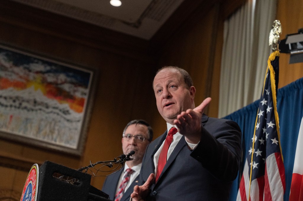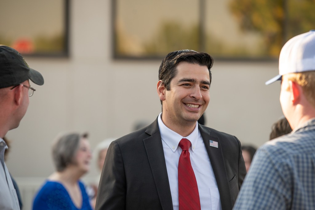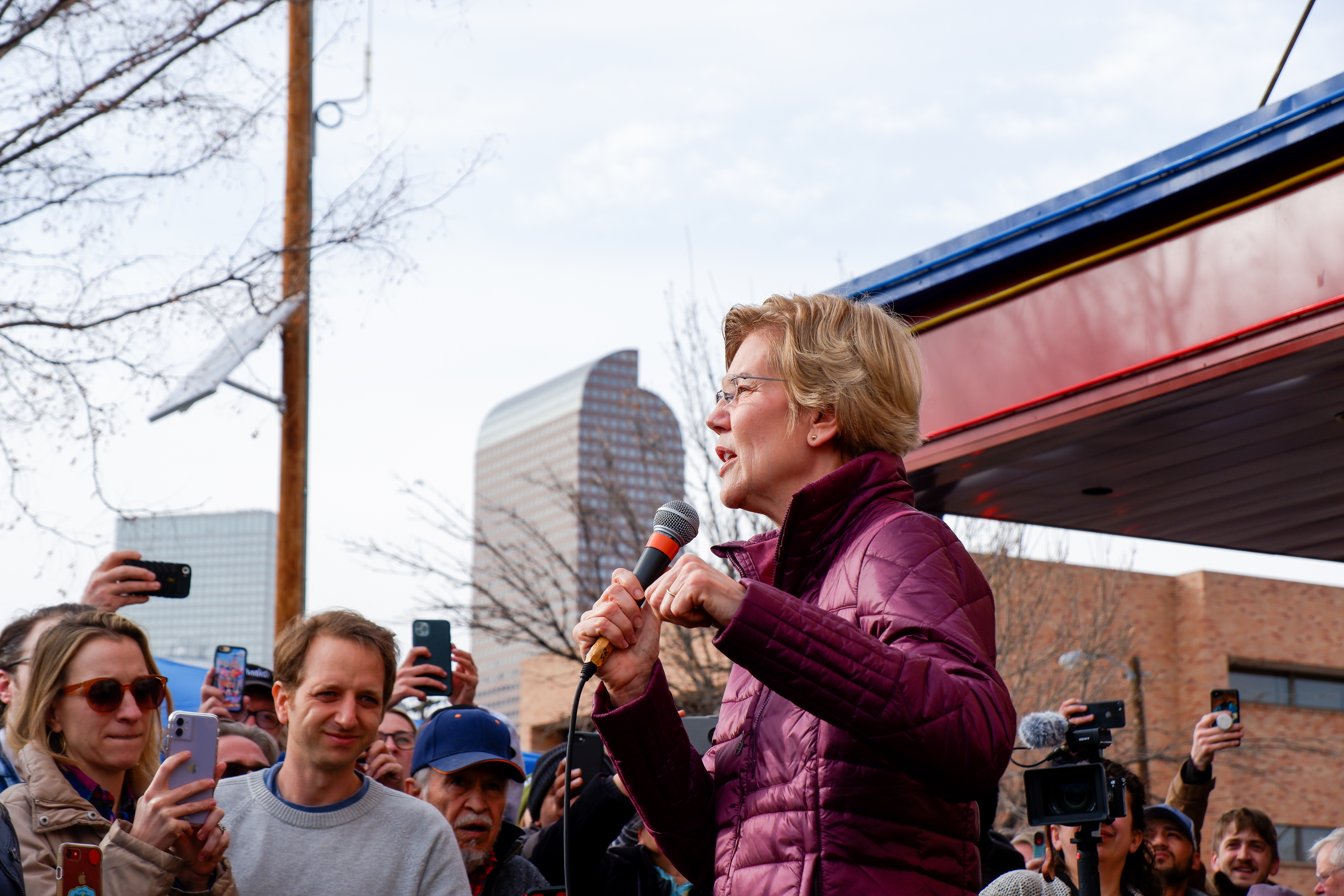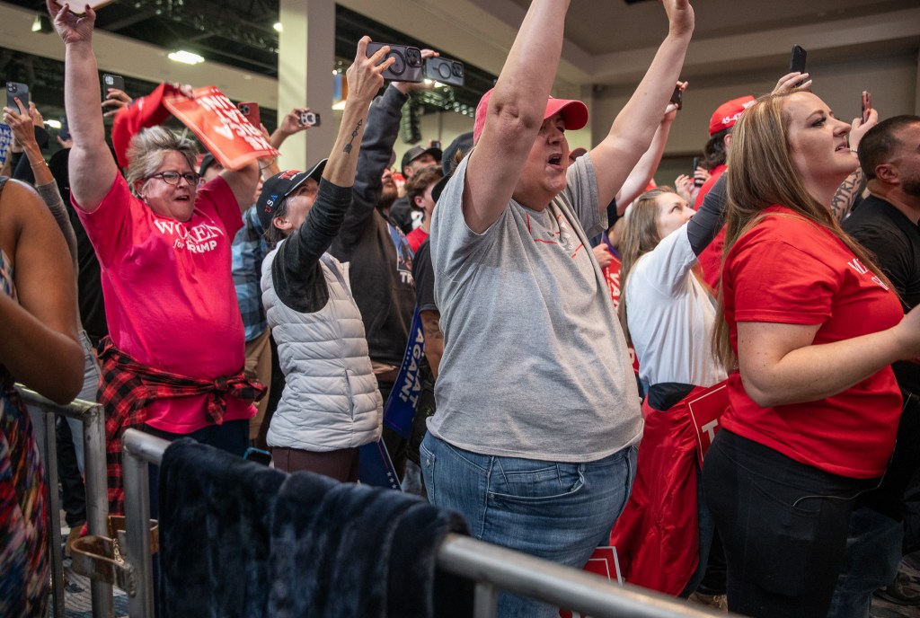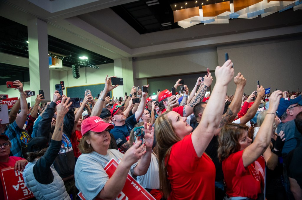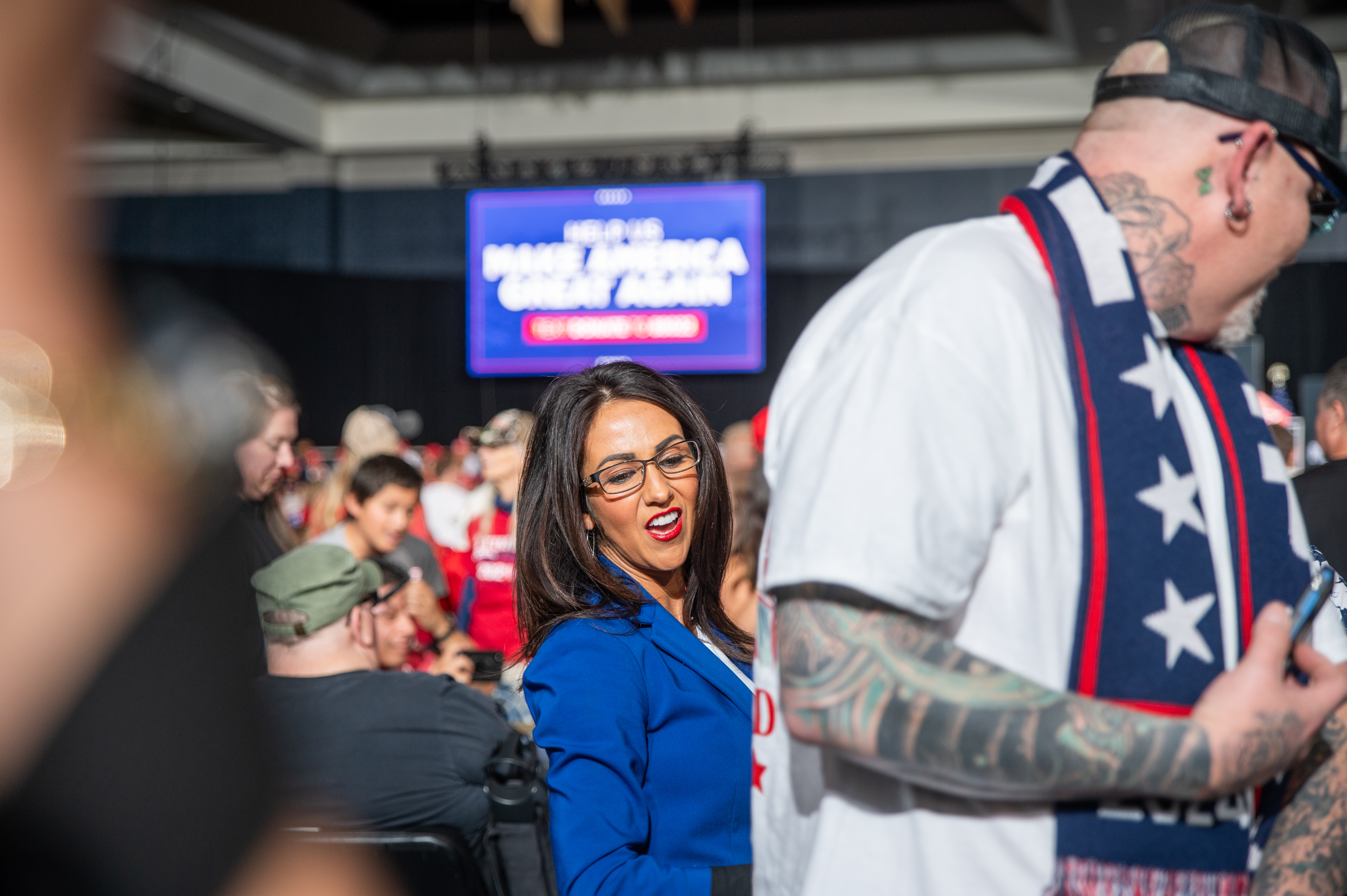U.S. Rep. Lauren Boebert, R-Windsor, checks out a T-shirt before former President Donald Trump speaks at a rally in Aurora, Colorado, on Friday, Oct. 11, 2024. (Jesse Paul, The Colorado Sun)