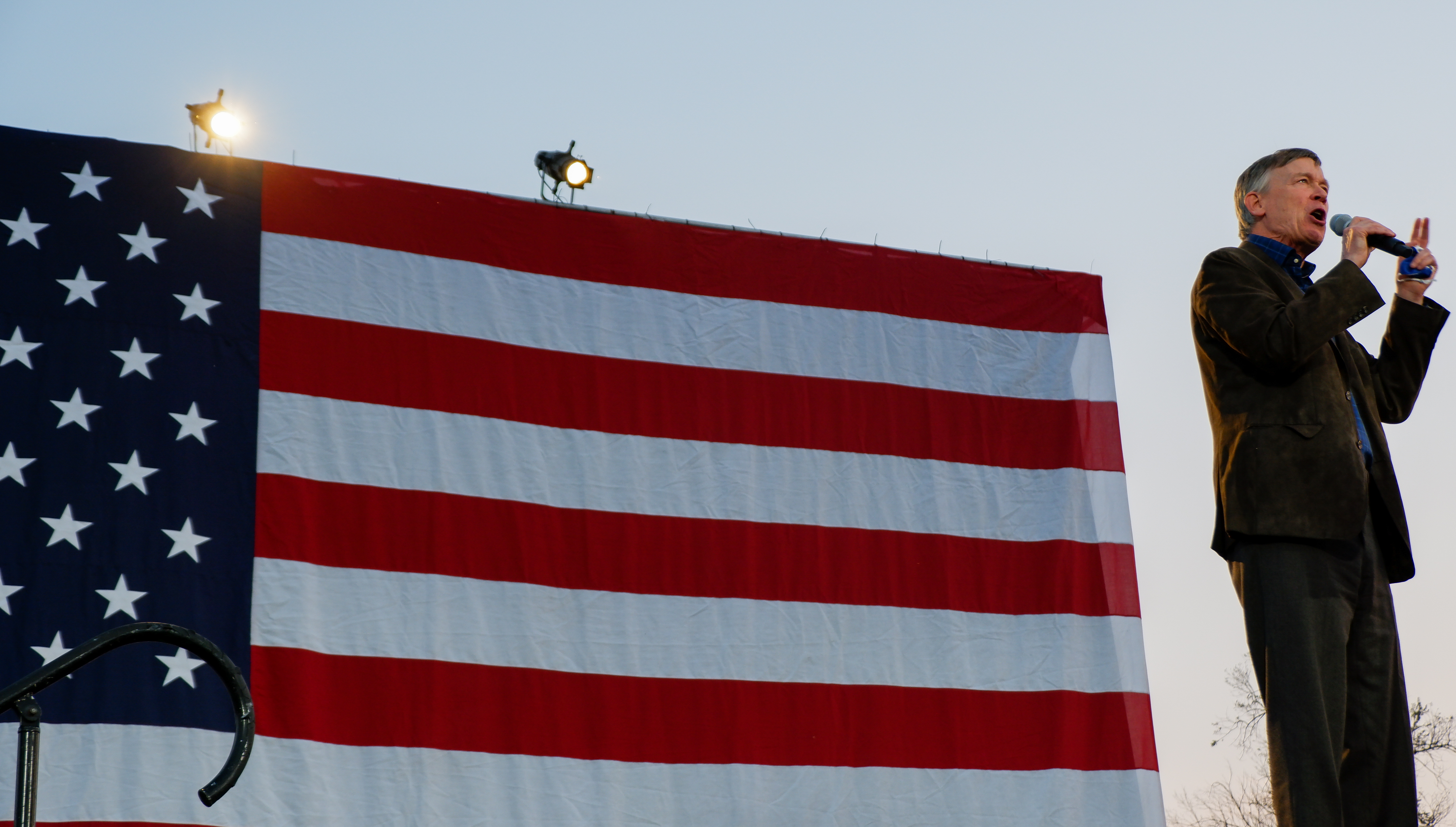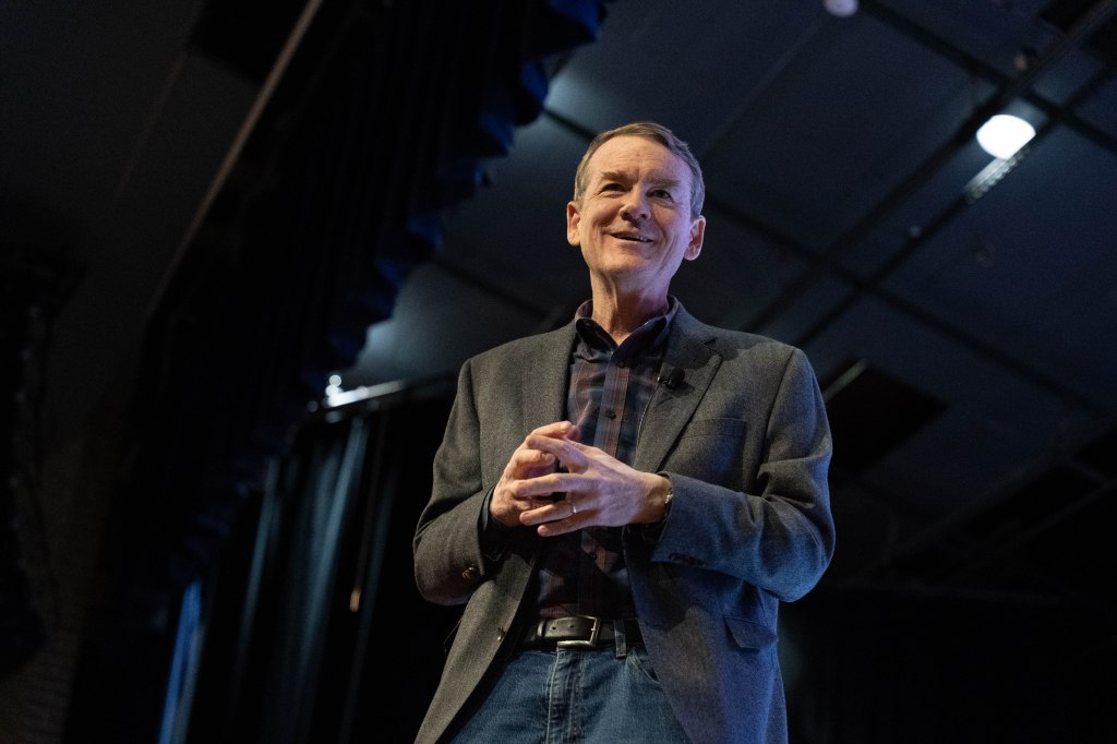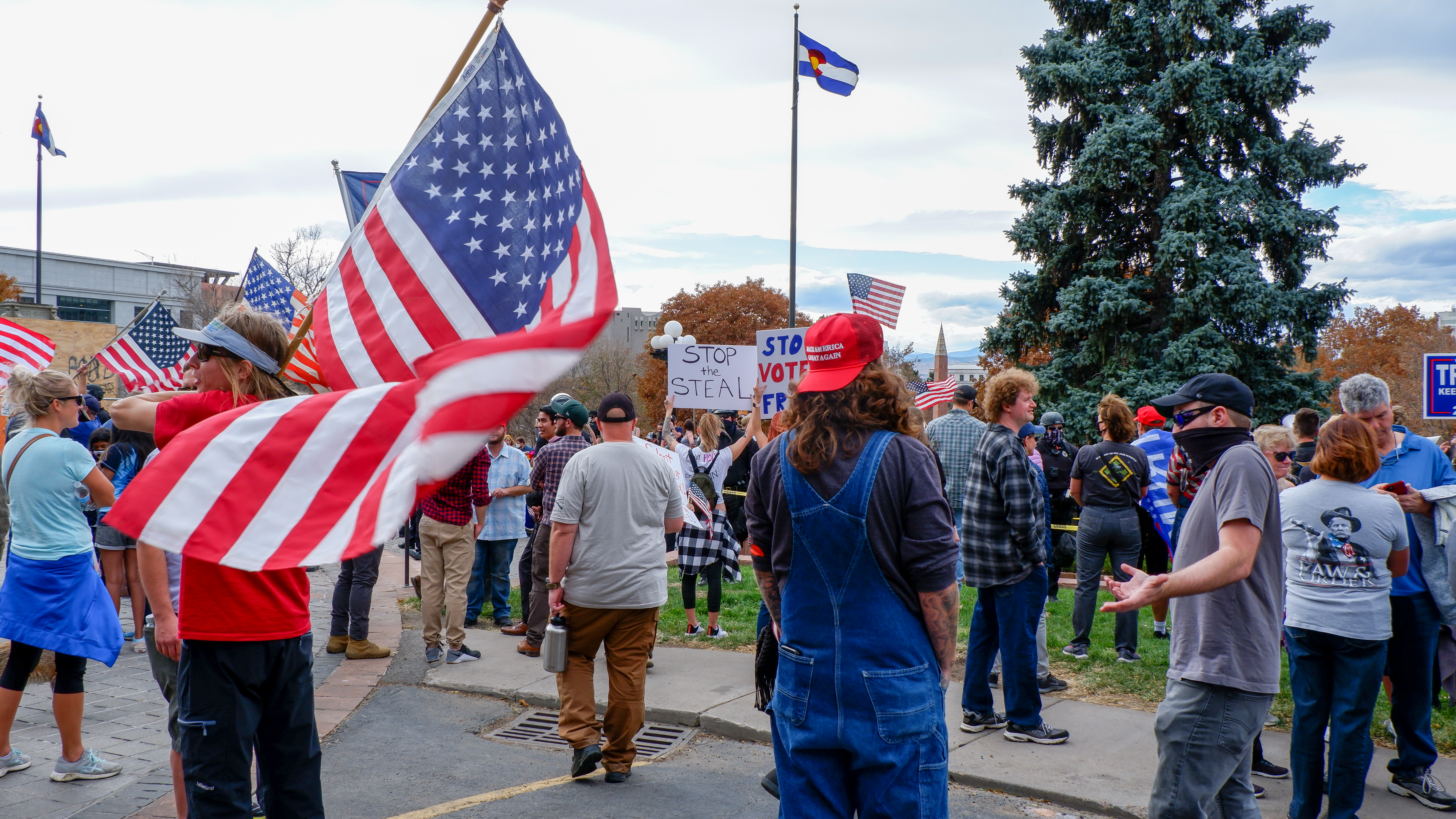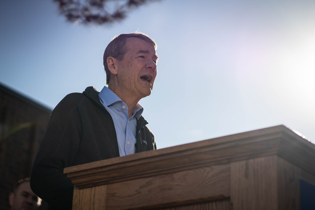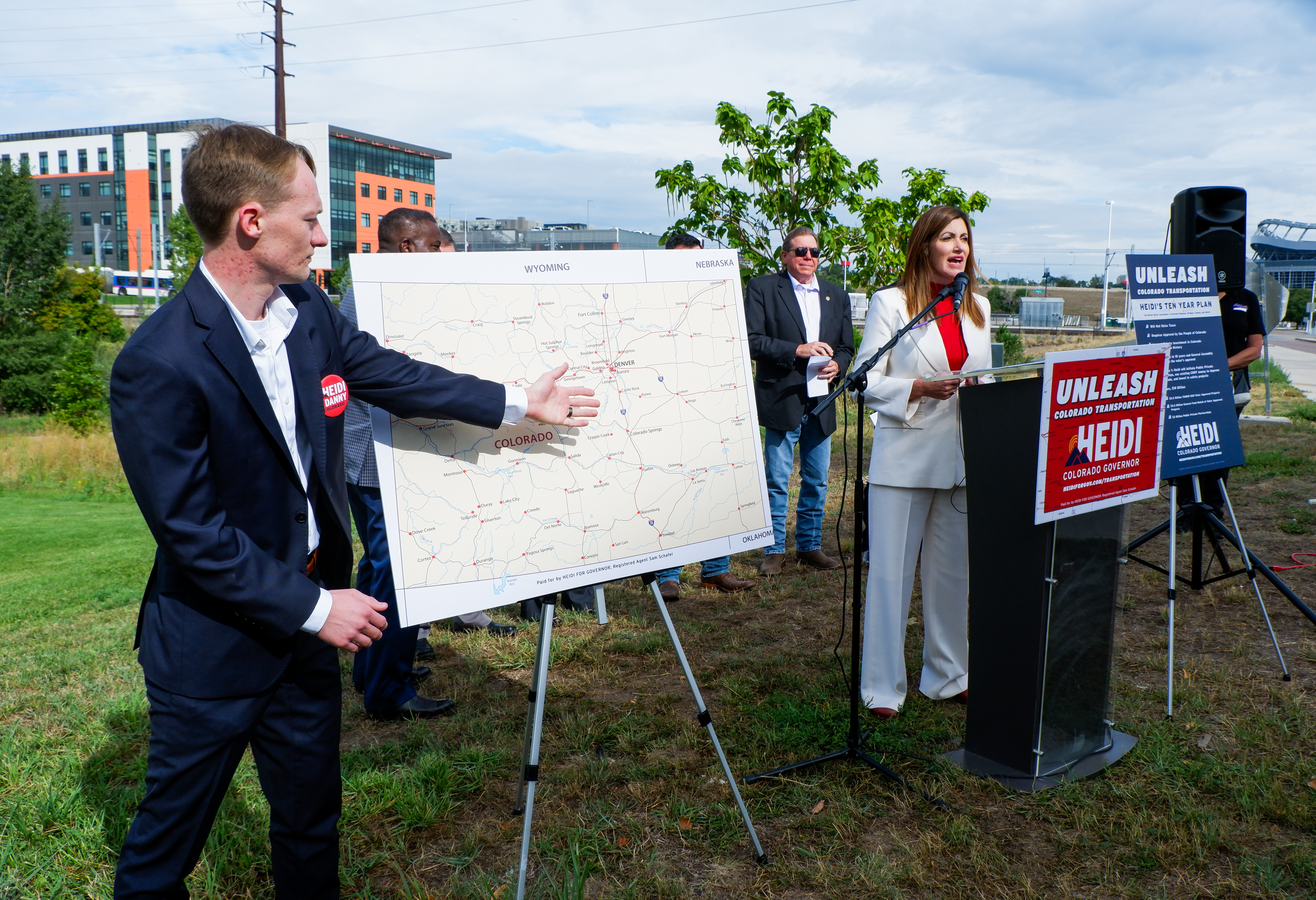 U.S. Rep. Lauren Boebert, R-Windsor, checks out a T-shirt before former President Donald Trump speaks at a rally in Aurora, Colorado, on Friday, Oct. 11, 2024. (Jesse Paul, The Colorado Sun)